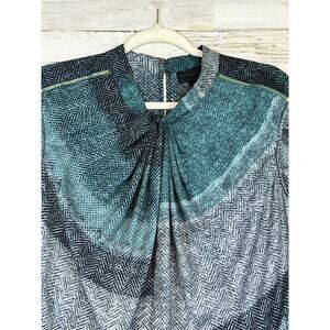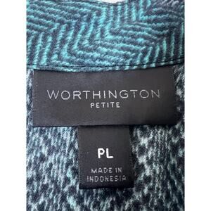 Worthington Womens Blouse Petite Large Teal Blue Flowy Gold Zippers Striped Soft. This blouse will add a touch of toughness to your wardrobe with it's zipper details on the shoulders. It can be worn casually, or dressed up with a simple blazer for work. Office siren, metal, unique. See photos for details and measurements.