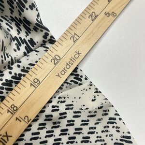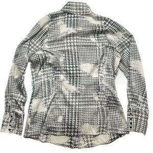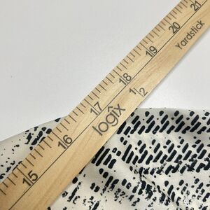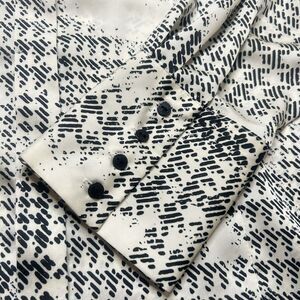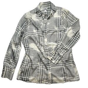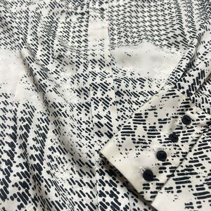 This Worthington women's button-up shirt is a versatile addition to any wardrobe. The minimalist cream geometric pattern is perfect for formal occasions, workwear, business meetings, and travel. It features a classic fit with long, fitted sleeves and a modern pleated collar for added style. The shirt is made of durable polyester material and comes in a size L, suitable for regular-sized women.