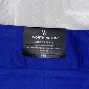 Worthington Women's Modern Fit Slim Leg w/Cuff, Size 10. Sits on the waist, relaxed through the hips and thighs. Just want to point out that there is small faded area on picture #5, zoom to see better, otherwise the pants are stunning royal blue color with cuffs on the bottom.