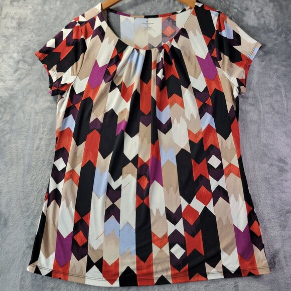 Worthington petite PL womens top 🖤 bold geometric print in red purple black beige 🤎 lightweight stretch fabric with pleated neckline and short sleeves 👚 versatile for office career or everyday wear