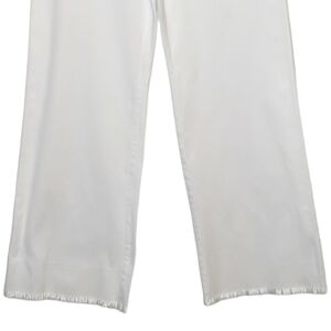 Beautiful bright white cotton/spandex flat front trousers with wide leg and ruffle hem. silver metal buttonsaccent front and rear pockets.