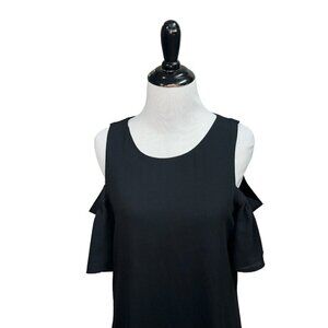 Worthington Women's Mini Dress in Size 6. Open Shoulder, Chiffon Layer with Lining. Ruffle Sleeves. Solid Black. 100% Polyester. Great condition.