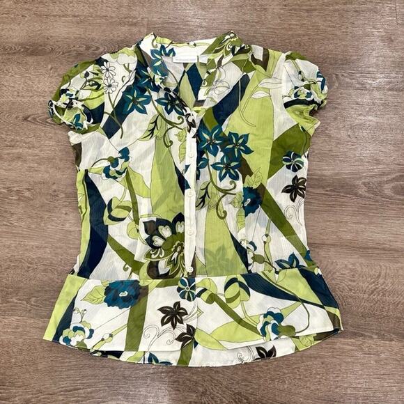 Worthington Women's Size 8 Y2K Babydoll Top Blouse Green Floral 70s Print Sheer