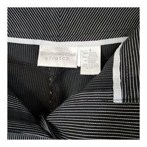 Worthington Stretch Dress Pants Flat Front Ankle Length Size 8 Black StripedVery cute black with stripesKick pleat opening at anklesLike new conditionMeasurements in the photos