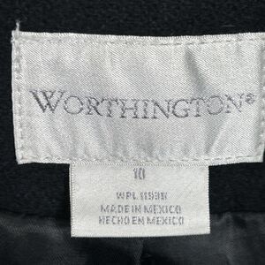 This classic black Worthington trench coat is made from a wool blend with faux fur accents, featuring a long 48" length. The coat is tailored for women in size 10 and has a lined interior with a collared neckline and button closure. It is designed for winter, fall, and spring occasions, ideal for travel, casual outings, or business wear. With a vintage aesthetic and solid pattern, this stylish coat includes pockets, long sleeves, and polyester insulation for added warmth and comfort.