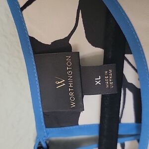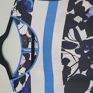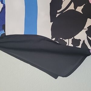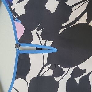 Short sleeve top. Lightweight, semi sheer fabric. Doesn't stretch. Black with white and blue and little bit of lavender in there. Floral pattern. Keyhole opening in back with single button closure. Great for the office. Great condition. Vibrant and bold pattern.
