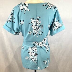 Beautiful light blue top with white floral print tie front. Banded waist with tie front. Short cuffed sleeves. EUC