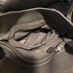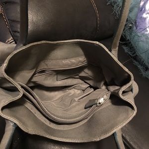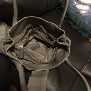 Beautiful Worthington, gray with light trim on wear in a turquoise blue color, silver flap snap magnetic closure. Has a tiny dot maybe a ink dot, not sure, but very clean inside. Has two zipper pockets and two small pockets. Not sure on material type but it's easy wipe off and go.