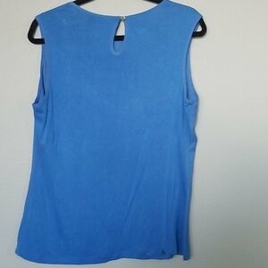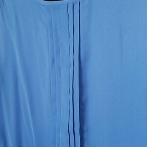 Keyhole in back. Stretchy fabric in back, silky non stretch fabric in front. Smoke free home. Has pleats in the front. Has some light discoloration in the back from hanger.