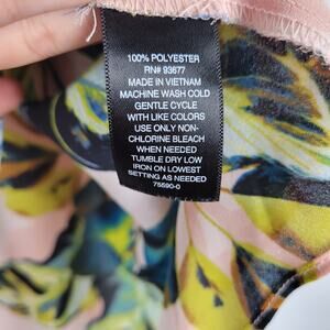 Worthington split neck roll tab sleeve pop-over tunic top in pink with varying shades of green leaves. It is lightweight. There are non pockets