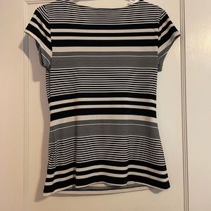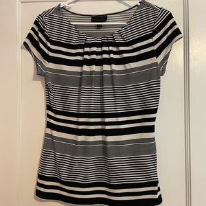 Going back to the office? Try this cute black and white striped Worthington cap sleeve shirt in petite small with pleat detail at collar.