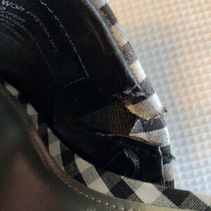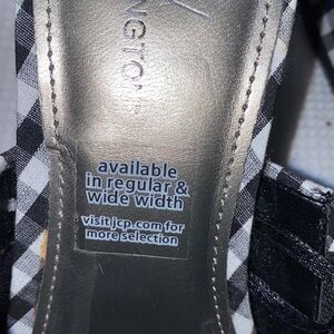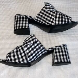 Worthington woman’s open toe mules plaid in white and black, gently used and very comfortable.