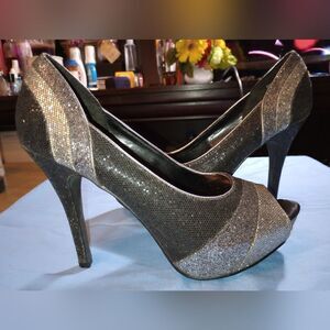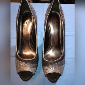 Worthington 5 " gray and black sparkly open toe cone heels, size 9M