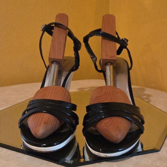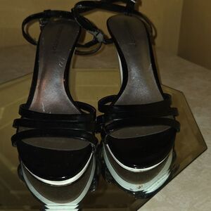 Chic black heels with sleek straps. Ideal for any event. Stylish and comfortable. The ankle straps does have wear, and the ledt side has a small mark-all you can see in the pictures. The left shoe has a scuff mark on the front toe. With that said, this is still a good shoe for a low price if you are looking for a 1 or a few times wear for a event or an occassion.