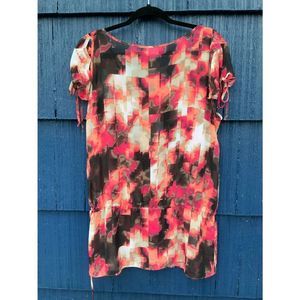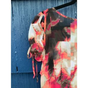 Description: violet and black blouse with geometric pattern around neck. No stains or cuts on item.