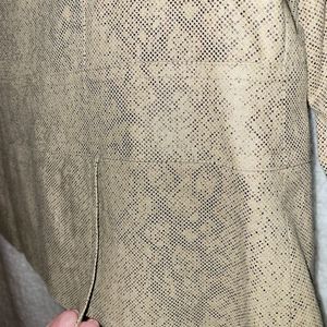 It is a size 14, it is pure Elegance against the skin and you look will look like a million dollars, tan with a darker tan mixed in, all buttons and everything are there. I wish it fit me but it has never been worn.
