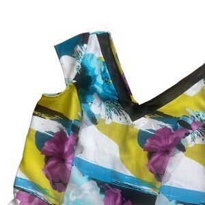Brighten up your wardrobe with this stunning Worthington floral blouse. Featuring a v-neckline, cap sleeves, and a flattering peplum hem, this top is perfect for both work and weekend outings. The bold watercolor-inspired floral print in turquoise, purple, white, and lime green adds a fresh and vibrant touch.