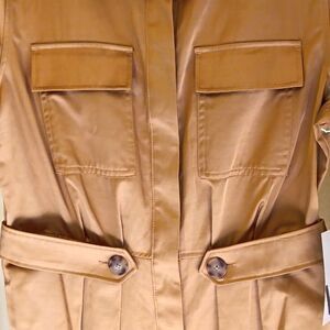 Color: Pumpkin Ale. The stock photos are best for color, I had trouble capturing it accurately. Warm gold satin utility style jumpsuit by Worthington. Hidden button up front. Two flap pockets on bodice. Wrap arount belt that buttons in front. Long sleeves. Pleats at waist. 14 inch rise, 26 inch inseam. Sleeves 24. An edgy statement with so much style.
