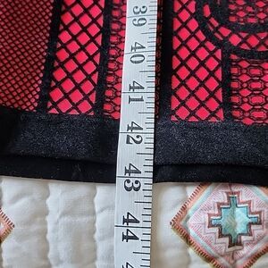 Worthington red polyester blend fitted sheath dress with black velvet flocking. Round neckline and cap sleeves. Zips in back.