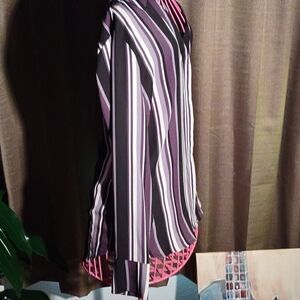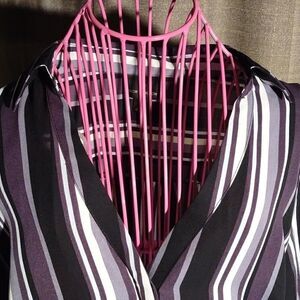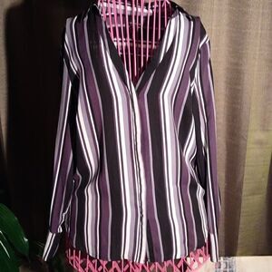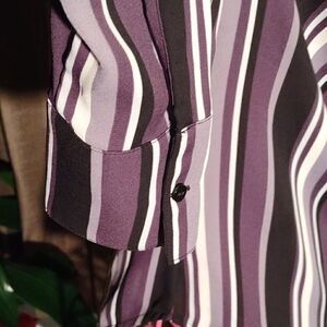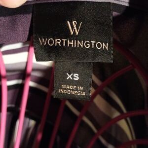 This Worthington purple, black and white striped, long sleeve blouse is a size XSmall. Buttons down the front with buttoned sleeves. 100% polyester and machine washable. Pre-owned and in like new condition. All offers welcome.