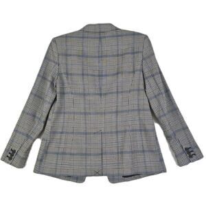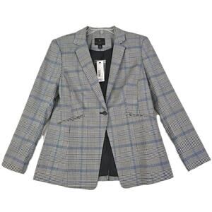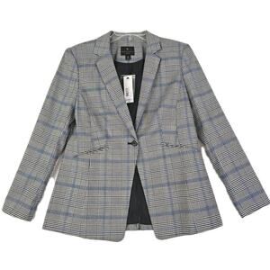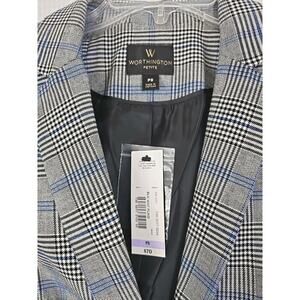 This Worthington Women's Size SPetite Gray/Black Plated Print Career Blazer Jacket is perfect for adding a touch of sophistication to your workwear or business attire. Made from a blended fabric with a polyester lining, this tuxedo-style blazer features a three-button sleeve and a one-button front closure. The jacket comes in a classic and modern plaid pattern with a regular fit and long sleeves, making it suitable for all seasons. Designed by Worthington Industries in Vietnam, this blazer is a stylish and timeless addition to any woman's wardrobe.