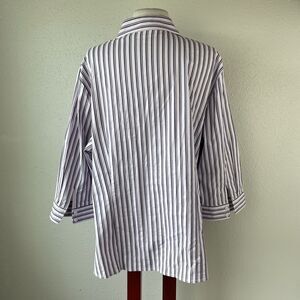 Love the purple colors and striped design on this stylish top by Worthington Woman. It measures 24 inches armpit to armpit laying flat and 29 inches in length from shoulder to hem.