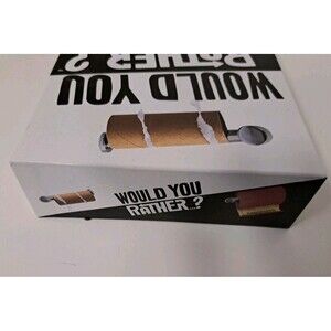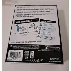 The product is a sealed copy of the game "Would You Rather" by the brand Spin Master Game. This party game is designed for a minimum of 2 players and includes cards, tokens, and a spinner. The game is themed around fun and exciting scenarios that players must choose between, making it entertaining for both boys and girls aged 14 years and up. Manufactured in Vietnam, this contemporary board game is a great way to liven up a party or game night with friends. NEW IN BOX, SEALED.