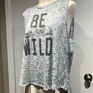 This Wound Up muscle tee features a heathered gray pattern with a bold 'BE WILD' graphic in black. Its sleeveless design and boxy, relaxed fit make it perfect for casual wear.