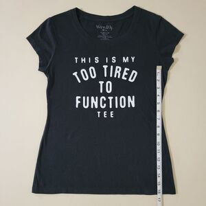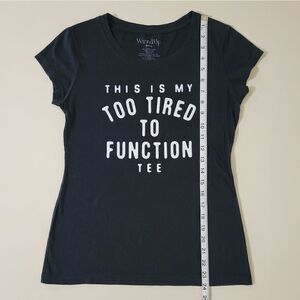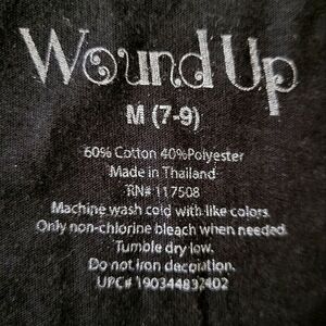 Trendy style abounds on this black Juniors' graphic tee by Wound Up. This black crewneck has short sleeves and in white letters on the front states: