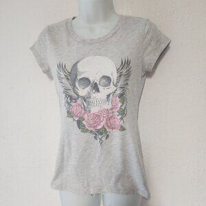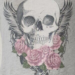 Wound Up graphic Tee, Grey with roses and skull in size small