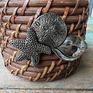 This 3.25" tall beautiful woven wine basket is perfect for any occasion. The round shape and small size make it easy to carry and store. The basket features a lovely seashell metal accent which adds a touch of bohemian style to any room. It comes with a cork holder and 5 cocktail picks or forks, making it ideal for entertaining guests. The mixed materials used in the basket's construction ensure that it is easy to care for, while the seashells embedded in the design make it suitable for both indoor and outdoor use. This original piece is a must-have for any basket or wine bottle holder collector. This wine bottle basket with five pickle fork set is in good pre owned clean condition with some minor use wear. Please review the pictures for more details and size measurement information, thank you.