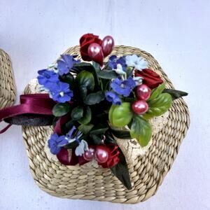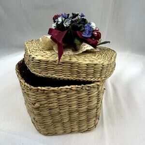 Woven Basket fine grass 6-sided with lid 5 x 3" lace flower on top