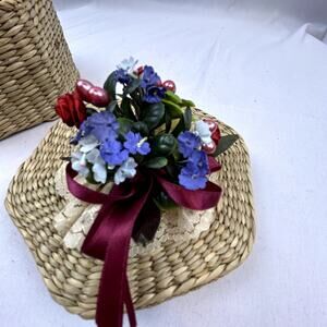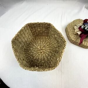 Woven Basket fine grass 6-sided with lid 5 x 3" lace flower top can be removed, I like it