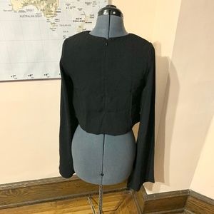 This hip length woven black bell-sleeved top would look great with a pair of skinnies and booties. The top also has a black invisible zipped on the back for a more sleek look.