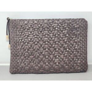 This woven clutch pouch offers a classic design with durable construction, ideal for carrying essentials. The striped lining adds a refined touch.