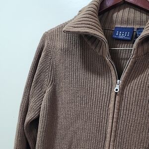 Classic tan zip-up sweater by Liz Claiborne. Features ribbed texture and front pockets. Ideal for layering.pit2pit 23" large 26 "