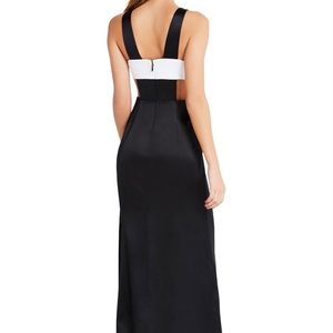 Sleeveless gown fitted through natural waist. Contrast white color detail on back. By BCBGeneration.