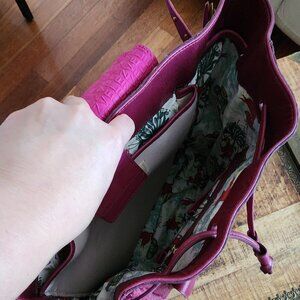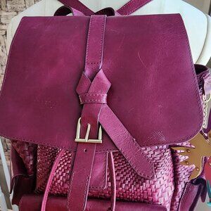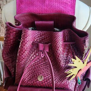 Stylish and versatile woven leather backpack in a rich dark purple / pink color. Perfect for everyday use with ample storage space.