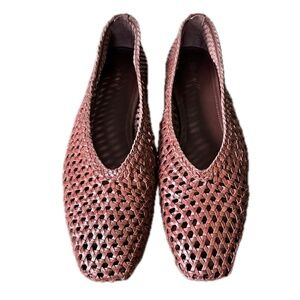 Absolutely gorgeous woven leather ballet flat to make any outfit unforgettable. I have been looking to replace the Frye Regina Woven Flat for years and this shoe is the closest that I've gotten. The color is a dark brown with a very slight reddish hue. It runs narrow for a 9.5, but will probably stretch over time. It was shipped in the shoe box so the box is scuffed, but it does come with a cute cloth Madewell travel bag for protection in your suitcase - see last image. Please note that there are very small almost invisible marks on the soles, but the rest of the shoe is perfect.