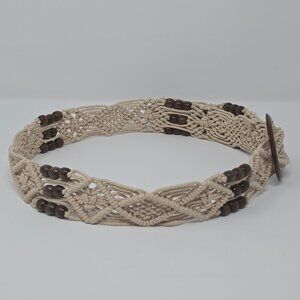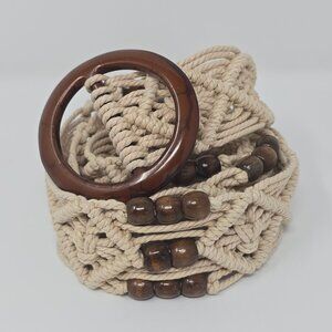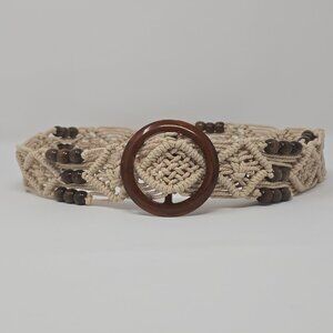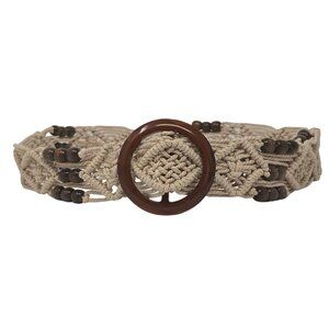 This woven macrame belt blends timeless style with a vintage-inspired touch, crafted from beige cord in a detailed diamond knot pattern and accented with dark brown wooden beads. The round buckle features a glossy, marbled brown finish with a faux tortoiseshell look. Measuring approximately 40 inches long and 1.75 inches wide, it has no belt holes and no stretch, creating a clean, structured silhouette. With its natural materials and handcrafted, woven texture, this piece adds rustic charm to boho, retro, and cottagecore wardrobes. Perfect for anyone who loves earthy, nostalgic accessories and wants to cinch flowy dresses, prairie skirts, or oversized tops with ease and personality.