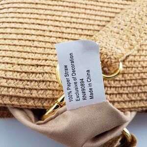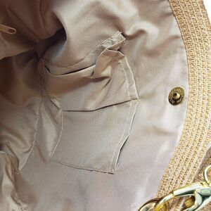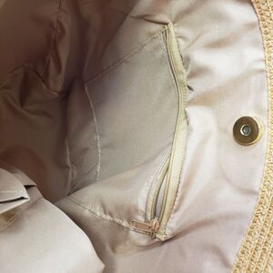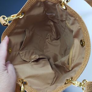 Multi-use size and style this bag would make a great purse or tote. Stitched straw/raffia material, seems like better quality construction. Metal grommets, strap attachment & feet make it both stylish and more durable. Color is most accurate in the second picture (at least by my monitor setting.) Lined in polyester with zippered and open pockets. Condition: Like new except for one small dark mark on the side, see photos. Bought at an estate sale, I believe this bag has never been used. Size: 12" h x 14" w at top x 4" d