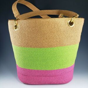 Woven Paper Straw w Metal Trim Purse Tote Beach Bag Green Pink Tan Footed Lined