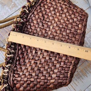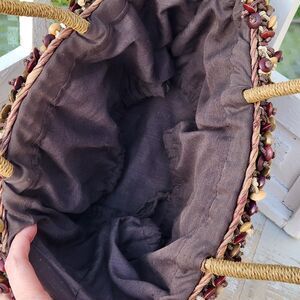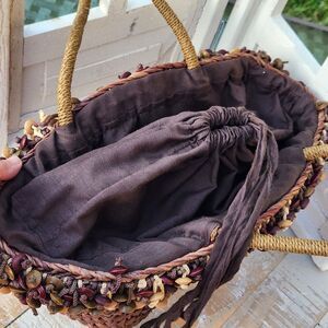 This medium size totebag features a boho beach vibe with earth tone beaded accents, perfect for travel or casual occasions. The bag is made of woven raffia with multicolor bead "fringe" accents, adding a unique touch to its design. The drawstring closure and double handles make it comfortable to carry, while the interior is lined and includes inner pockets for organization. The product is woven and showcases a nature-inspired theme, making it a stylish and eco-friendly choice for women looking to make a statement with their accessories. It's is in very good pre-loved condition. Please feel free to ask questions.