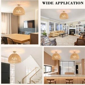 Stylish woven rattan ceiling light fixture. Features a natural tan color. Perfect for adding a warm touch to any room.