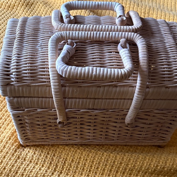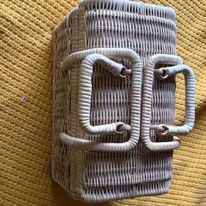 Chic woven rattan handbag with a natural tan color. Perfect for casual outings. Could be used for a handbag or a lunch box or picnic basket. However it is not insulated. It measures 10.5” long x 5.5” wide x 7” high.