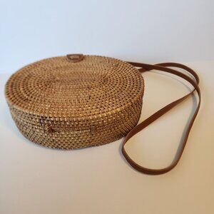 Woven Rattan Round Crossbody Bag With Leather Strap & Floral Lining