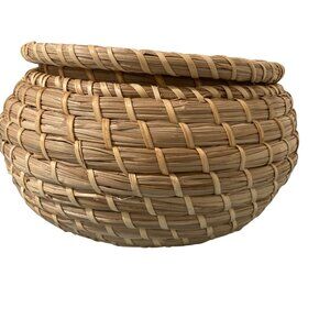 A round, handwoven basket crafted from natural materials, suitable for home decor or storage. Its lid provides secure coverage, enhancing functionality.