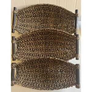 Beautiful set of nesting baskets that can be used for display , table or hanging wall decor. They have metal rods running through the weaving for stability and solid wood handles on each end.
