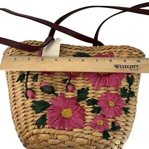 Woven Straw Purse Shoulder Bag Purse Embroidered Pink Flowers 10x7x5 in New