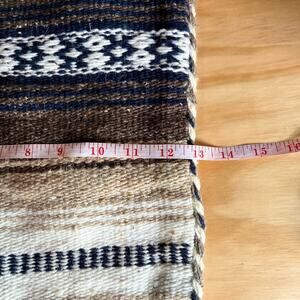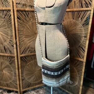 Chic woven crossbody bag with a striped design. Features shades of brown, cream, and black.
